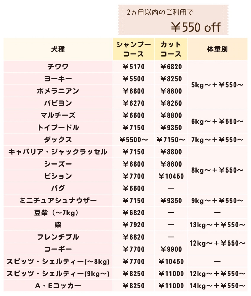 ・レーキング 小型犬¥550〜 中型犬¥880〜