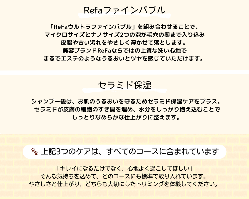 爪切りなどのお手入れを1つでも追加する場合はシャンプーコースとなります。